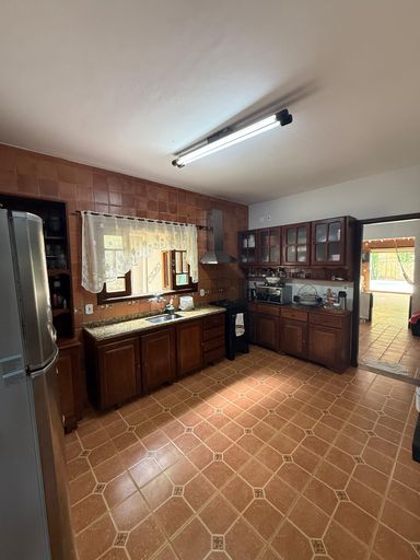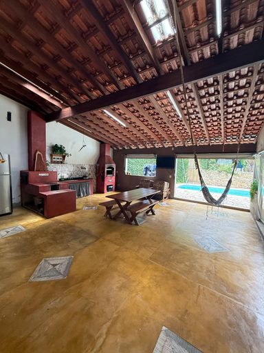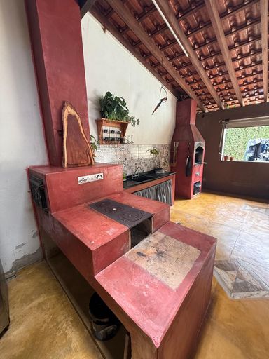 Espaçosa área gourmet com churrasqueira, forno e fogão a lenha